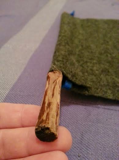 6.) Place the stick against the line that you drew on the back of the background felt and fold the background felt on top of the stick. Hot glue the stick and fabric together to encapsulate the stick into the fabric.